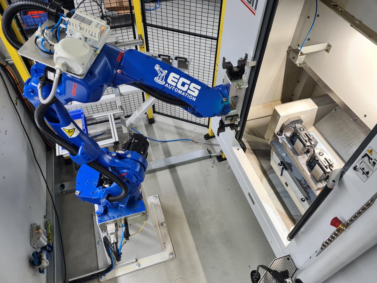 Bildunterschrift: Der Yaskawa GP12 bei der Maschinenbeschickung. Wenn er in Ruheposition gefahren wird, bleibt vor der Maschine ausreichend Platz für Rüstvorgänge und das händische Be- und Entladen von KleinserienWarum automatisieren und warum EGS?