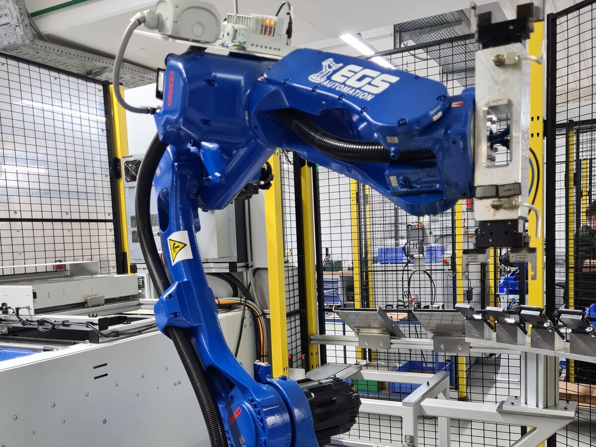 Das schnelle und präzise Werkstückhandling übernimmt dabei ein Yaskawa GP12, ein 6-Achs-Knickarmroboter mit knapp 1,5 Metern Reichweite und 12 Kilogramm Traglast.
