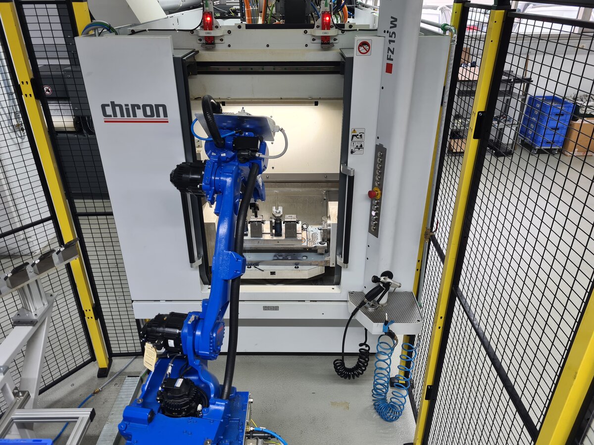 Die erste Roboterzelle bei Ernst Reiner wurde an ein bestehendes CNC-Bearbeitungszentrum Chiron FZ15W angebunden, das zuvor manuell beschickt wurde. Die Wechseltischmaschine wird auf einer Seite des Tisches be- und entladen, während auf der anderen Seite innerhalb der Maschine die Werkstücke bearbeitet werden. Das platzsparende Layout der EGS-Zelle überzeugte sofort – ein wichtiger Aspekt angesichts begrenzter Fertigungsfläche. Der Roboter wurde von EGS so positioniert, dass die Beschickung auch weiterhin per Hand möglich ist, zum Beispiel für Kleinserien oder zum Umrüsten und Einrichten. Die Umrüstung der Bestandsmaschine auf Automatisierungstauglichkeit – etwa durch den Umbau von Handspannvorrichtungen auf automatische Spanntechnik – stellte sich als aufwendiger heraus als zunächst angenommen.