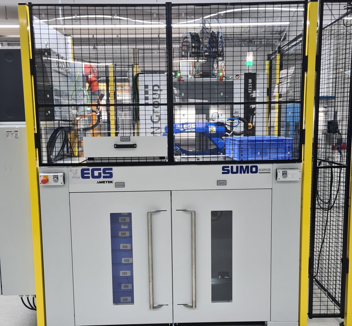 Bildunterschrift: Der SUMO Ecoplex2 kann durch die beiden Fronttüren mit Bodenrollern, auf denen Werkstückträger gestapelt sind, im Automatikbetrieb beschickt werden.