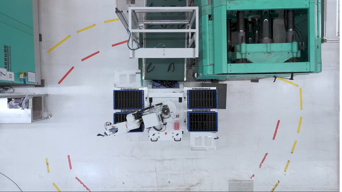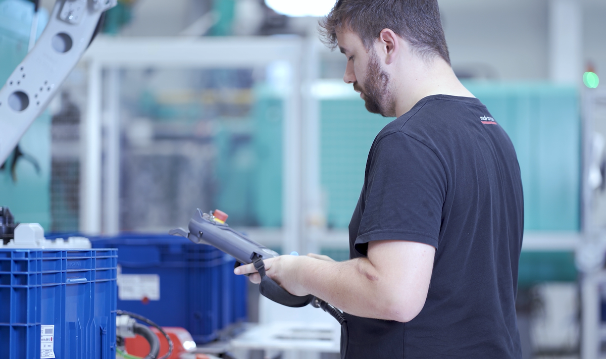 Das hier eingesetzte Handlingsystem base von FMB zeichnet sich durch seine konsequente Modularität aus. Ein standardisiertes Basismodul wird mit einem zum Anwendungsbereich passenden Industrieroboter ausgestattet. Verschiedene Greifer- und Werkzeugsysteme decken diverse Einsatzbereiche ab und mit ebenfalls standardisierten Erweiterungs- und Funktionsmodulen lässt sich die base auf spezifische Prozesse anpassen. So wird das Handlingsystem schnell und wirtschaftlich auf die jeweiligen Anforderungen ausgelegt. Darüber hinaus kann es aber auch für nachfolgende Aufträge problemlos auf andere Prozesse angepasst oder erweitert werden. Ein Bahnhofsystem, das die Energieversorgung sicherstellt, macht das auf Rollen gelagerte Handlingsystem mobil. Auf diese Weise kann man es an weitere Bahnhöfe andocken und mit einem Handlingsystem mehrere Prozesse an verschiedenen Einsatzorten und Maschinen im Unternehmen abdecken. Das hier eingesetzte Modul „Behälterzuführung“ bietet Aufnahmebereiche für KLT-Behälter direkt am Handlingsystem, in die der Roboter die Teile ab legt. Der Doppelgreifer ist präzise und nimmt gleich zwei Bauteile auf. Da bei der Firma Chroff auf der gleichen Spritzgussmaschine auch Teile produziert werden, die nur mit einem Sauger gehandelt werden können, lässt sich der Doppelgreifer ganz einfach per Schnellwechsler wechseln.