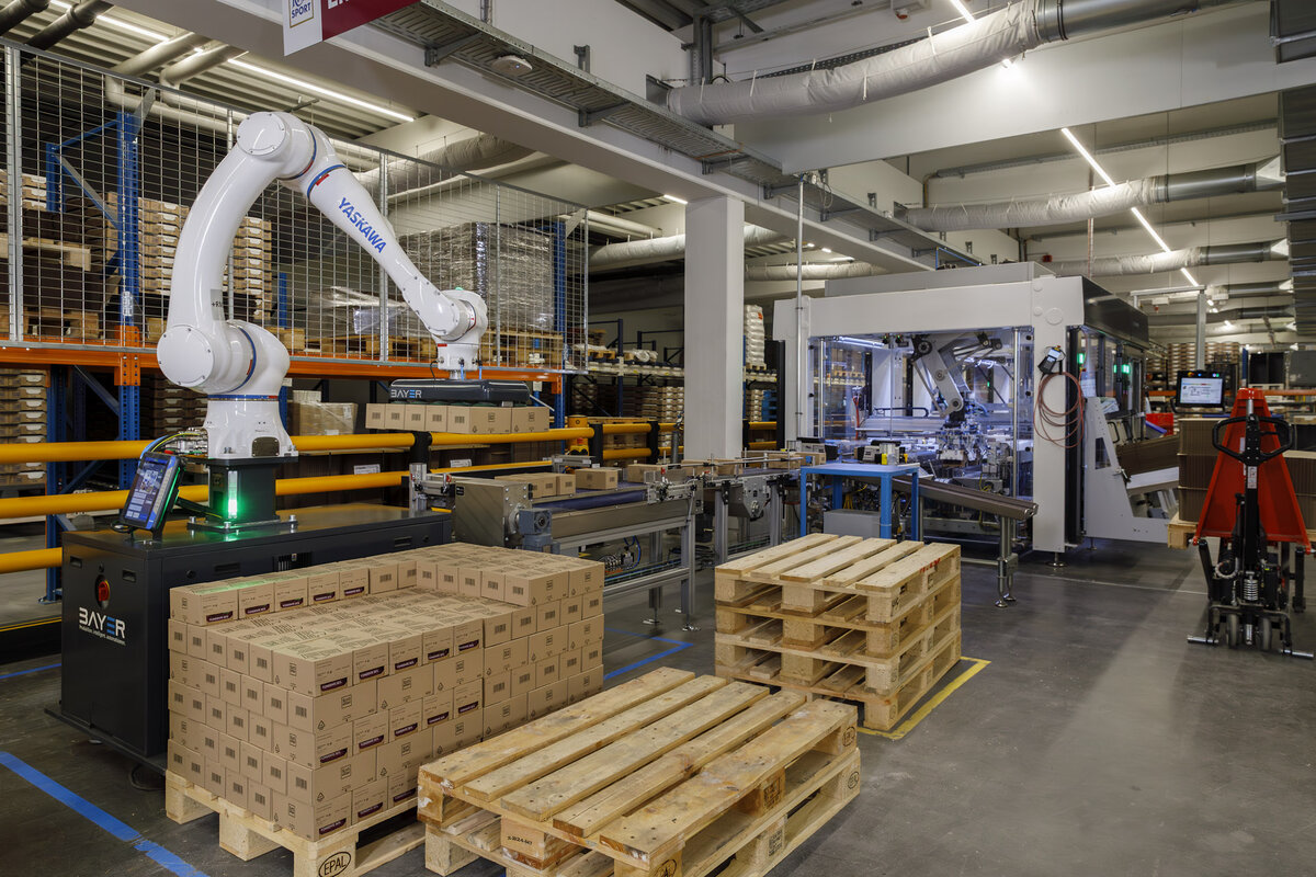 Ein zentrales Element der Lösung ist der von Bayer entwickelte Vakuumgreifer. Dieser ist geeignet für das Handling von Kartons, Trays, Kanister und Kleinladungsträgern sowie für Sonderanwendungen. Als Roboter arbeiten im PLT HC Palettiersystem standardmäßig Cobots der Baureihe HC („HC“ steht für „Human Collaborative“) von Yaskawa mit wahlweise 10, 20 oder 30 kg Tragkraft.