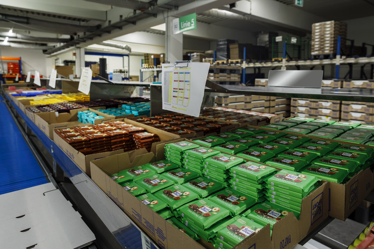 Bis die süßen Leckereien aus der Produktion der Alfred Ritter GmbH & Co. KG endgültig in die Auslieferung gehen können, steht ihre Konfektionierung am Logistik-Standort Reichenbach bei Stuttgart an. Das heißt: das Verpacken der beliebten Ritter Sport-Tafeln und anderer primärverpackter Schoko-Spezialitäten in Regalkartons oder Displays für den Handel sowie das abschließende Palettieren der Gebinde zum Abtransport per LKW. Gerade für diesen letzten Schritt in der Verpackungskette fehlte es in der Vergangenheit allerdings noch an einer effizienten und vor allem flexibel einsetzbaren Automatisierungslösung, um den zentralen Palettierer auch an entfernteren Stellen – wie z. B. am Verladetor – gezielt punktuell zu ergänzen.